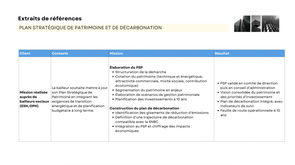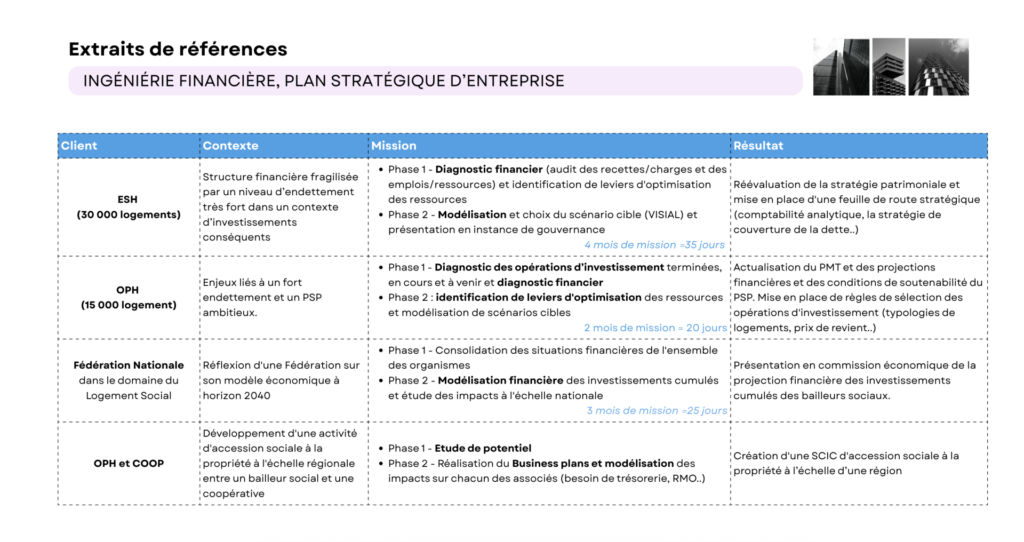 Le cabinet a notamment accompagné des organismes tels que Logi Métropole, Résidence Orléanaise ou Habitat du Nord, sur des projets impliquant des enjeux financiers, organisationnels et stratégiques.