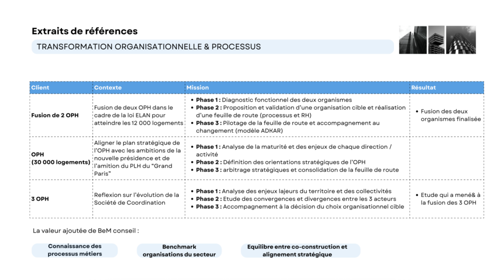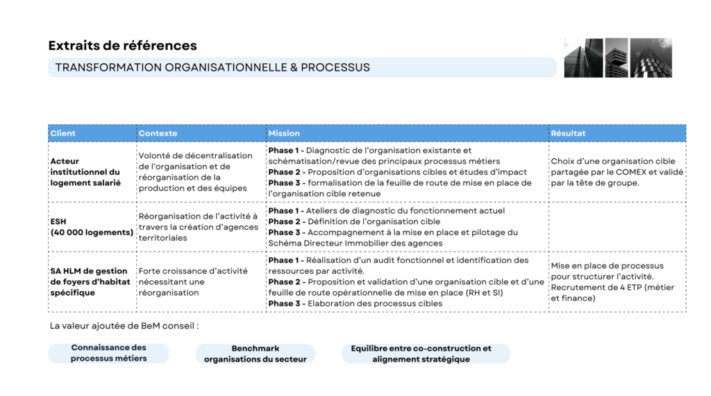 BEM Conseil intervient auprès d’acteurs publics et privés sur des missions à forts enjeux, notamment dans le secteur du logement social et des organisations structurées.